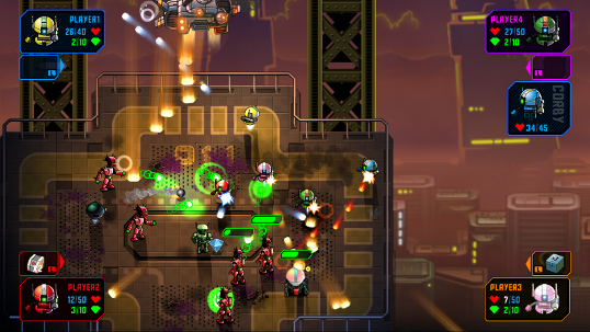Lots of robots, lots of lasers, lots of aliens, lots of explosions! The numerous retro arcade influences are front and center, but spiced up with a colorful modern style, a generous helping of sci-fi intrigue, and a dash of RPG ELEMENTS!